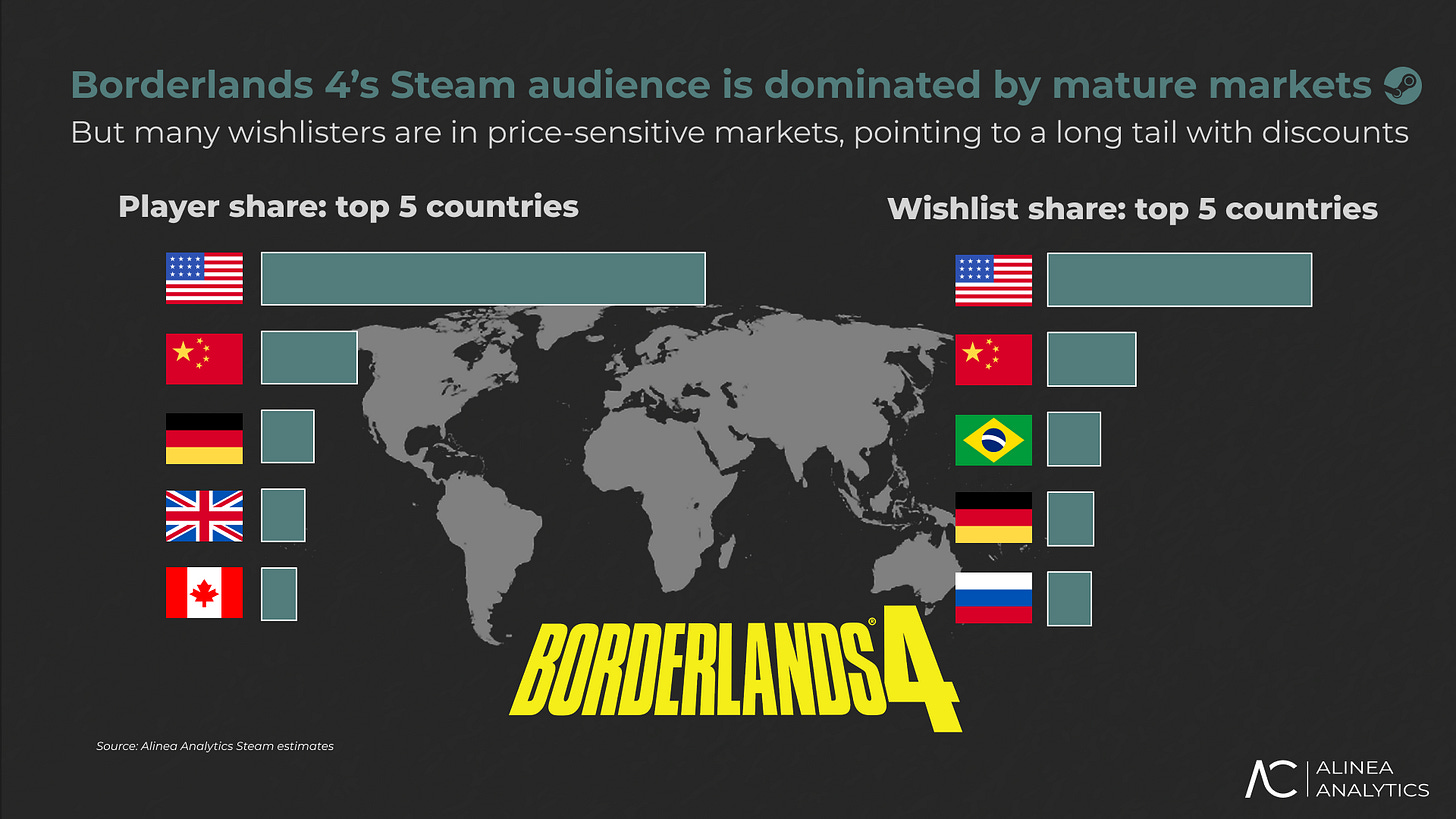 This mature-market-heavy distribution is common in a AAA game’s early days. As time goes on – and games get discounted – the shares in emerging markets tend to increase. It’ll be no different for Borderlands 4.