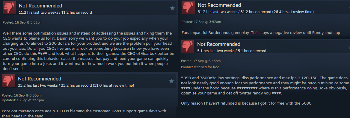 But CEO Randy Pitchford’s defensive comments are adding more fuel to the fire of the negative reviews, which you can see in many Borderlands 4’s reviews section on Steam, from which I’ve selected a few relevant ones below: