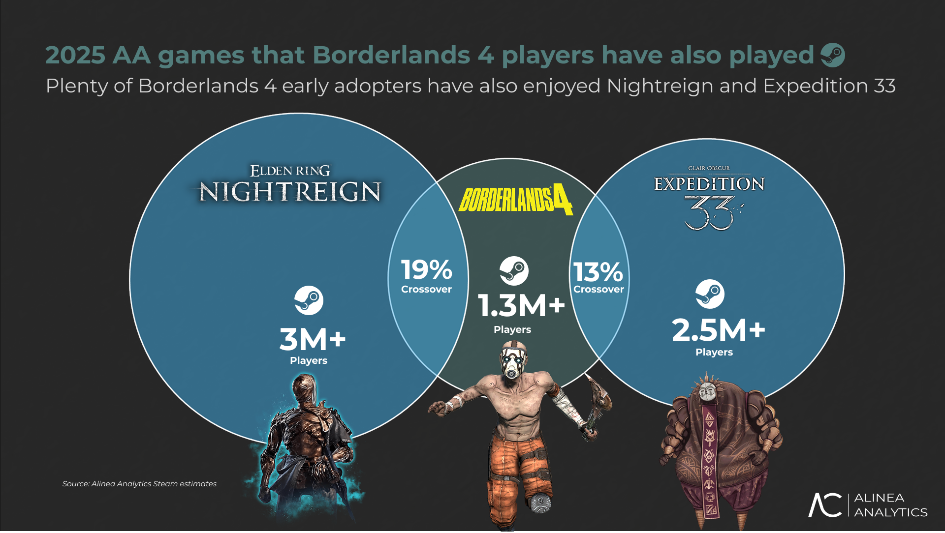 In terms of AA experiences, 19% of Borderlands 4’s players on Steam have played Elden Ring Nightreign (20% for PlayStation), while 13% have played Expedition 33 (22% for PlayStation).