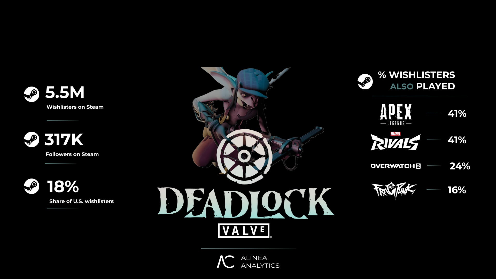 Crazy stat: almost 8% of Marvel Rivals’ Steam players (that’s over 2M of them) have gone out of their way to wishlist Deadlock. Marvel Rivals stole a lot of players from Overwatch, and now Deadlock is on track to hoover up some of Marvel Rivals’.