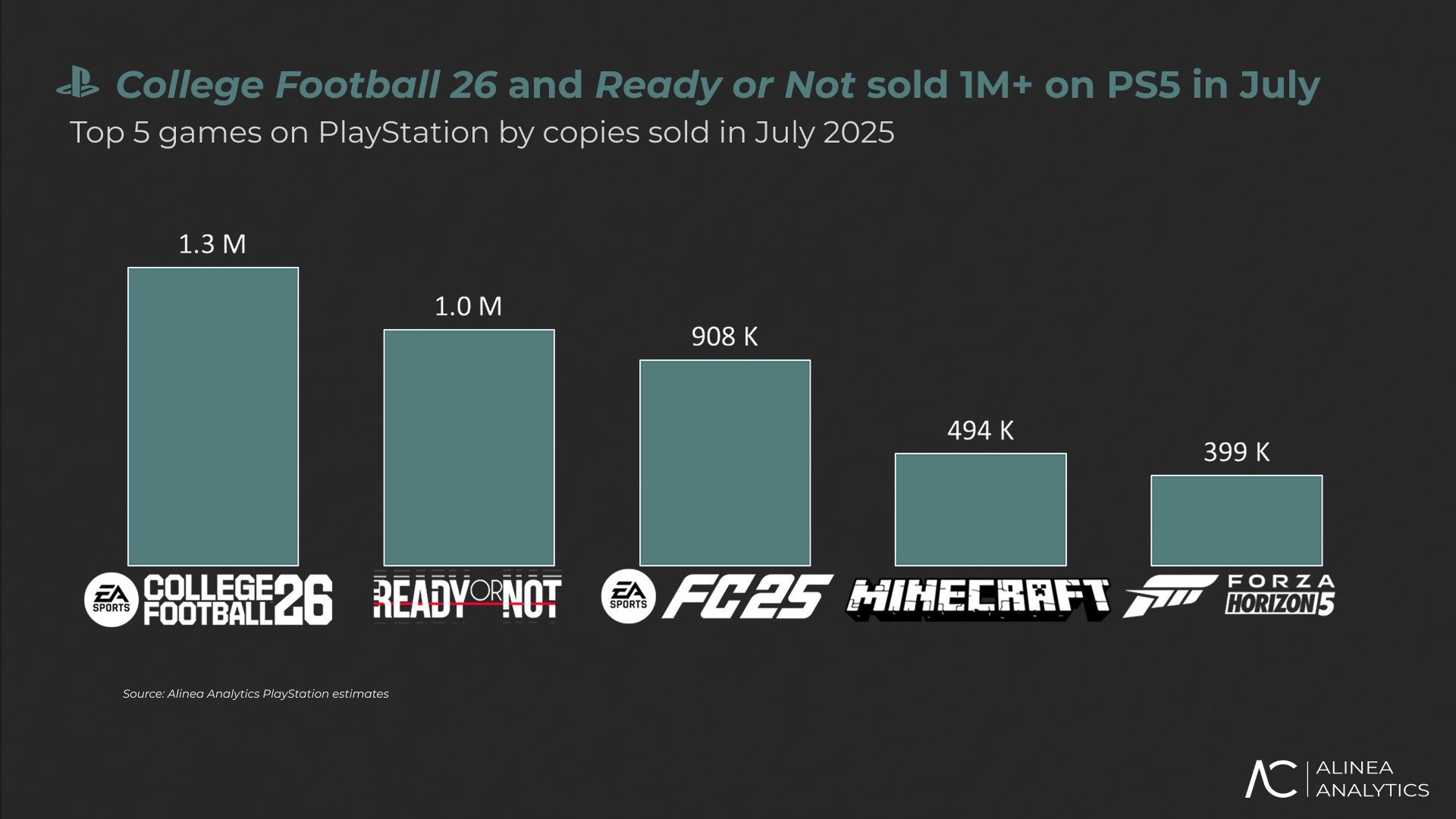 EA FC 25 (#3) sold 908 K copies on PlayStation in July, thanks to the price drop to $15 on the PlayStation Store. Owing to a similar price drop, FC 25 was last month’s top game by copies sold. We expect to see even more aggressive pricing promotions ahead of FC 26’s launch next month – one last hurrah before EA’s cash cow moves to its next edition.