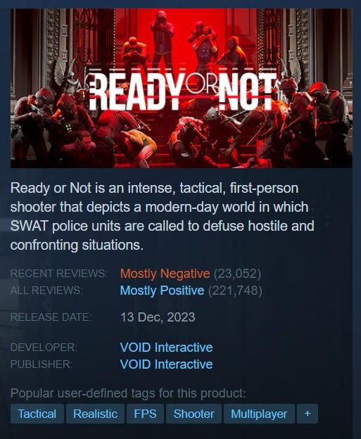 Ready or Not’s launch hasn’t been all sunshine and roses. Some PC players have felt alienated, leading to them "review bombing" the Steam version to protest blanket changes made for the console release. While Ready or Not has mostly positive user reviews overall, the recent reviews are mostly negative: