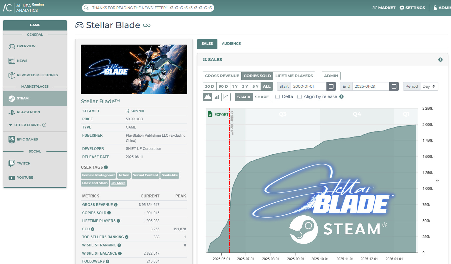 As you can see in the Alinea Platform screenshot below (get your free trial here!), Stellar Blade’s Steam port just hit 2M copies sold. Almost half are based in China. Stellar Blade’s Steam copies sold are catching up the PS5 version – and China is the reason.