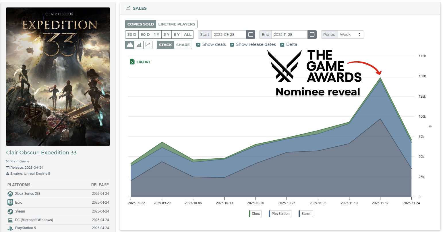 Expedition 33 on Game Pass (Xbox consoles and PC) has reached 3.3M players (poetic, I know). Expedition 33 has SOLD 5.5M+ copies overall, with about 3M on Steam, 2M on PS5, and around 500K on Xbox. Its inclusion on Game Pass has undoubtedly cannibalised copies sold on Xbox and PC. This extended to the hype from Expedition 33’s 11 nominations for The Game Awards. That week, around 100K copies were sold on Steam and 50K on PS5, but fewer than 5K were sold on Xbox. More people bought Expedition 33 on PS5 last week than accessed it for the first time on Game Pass…