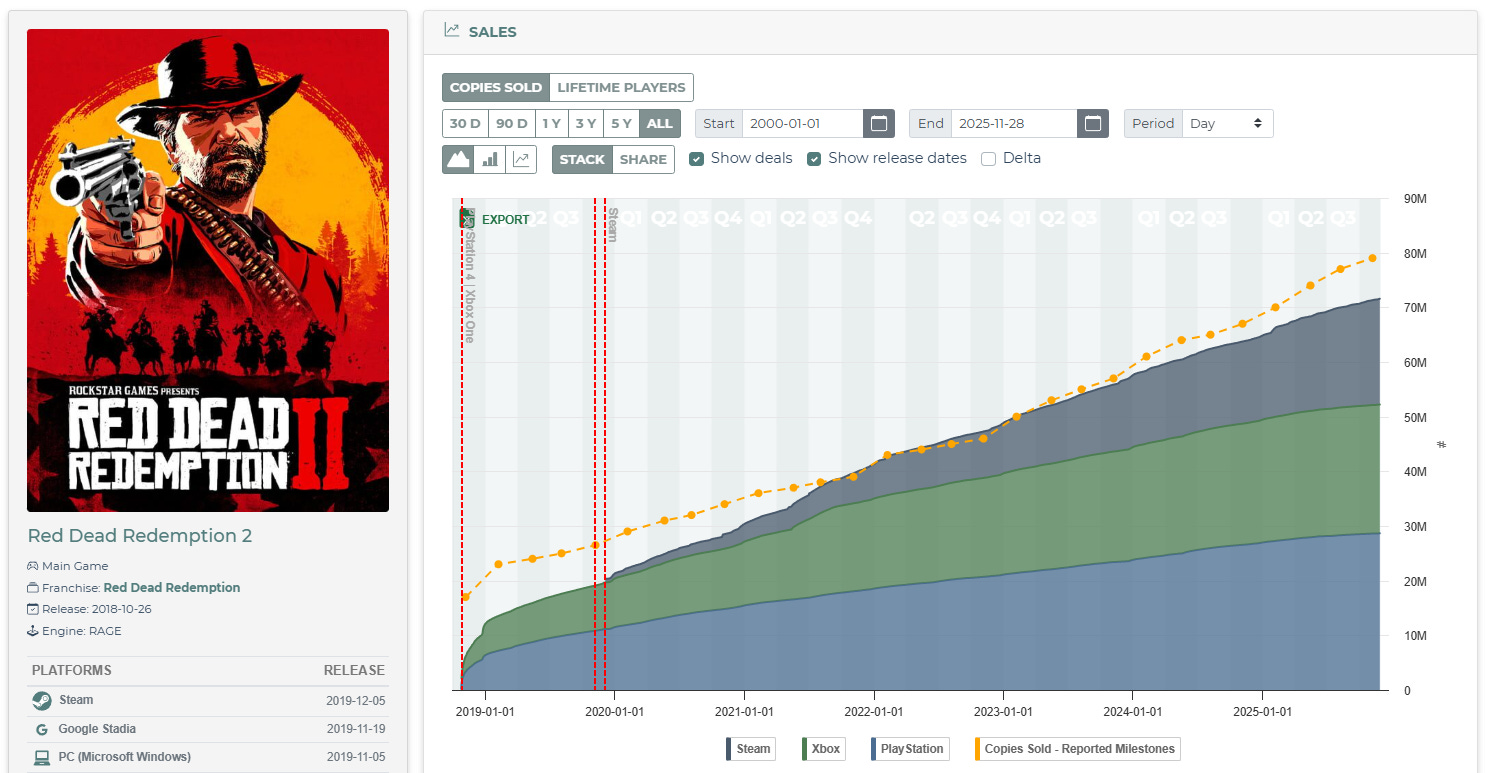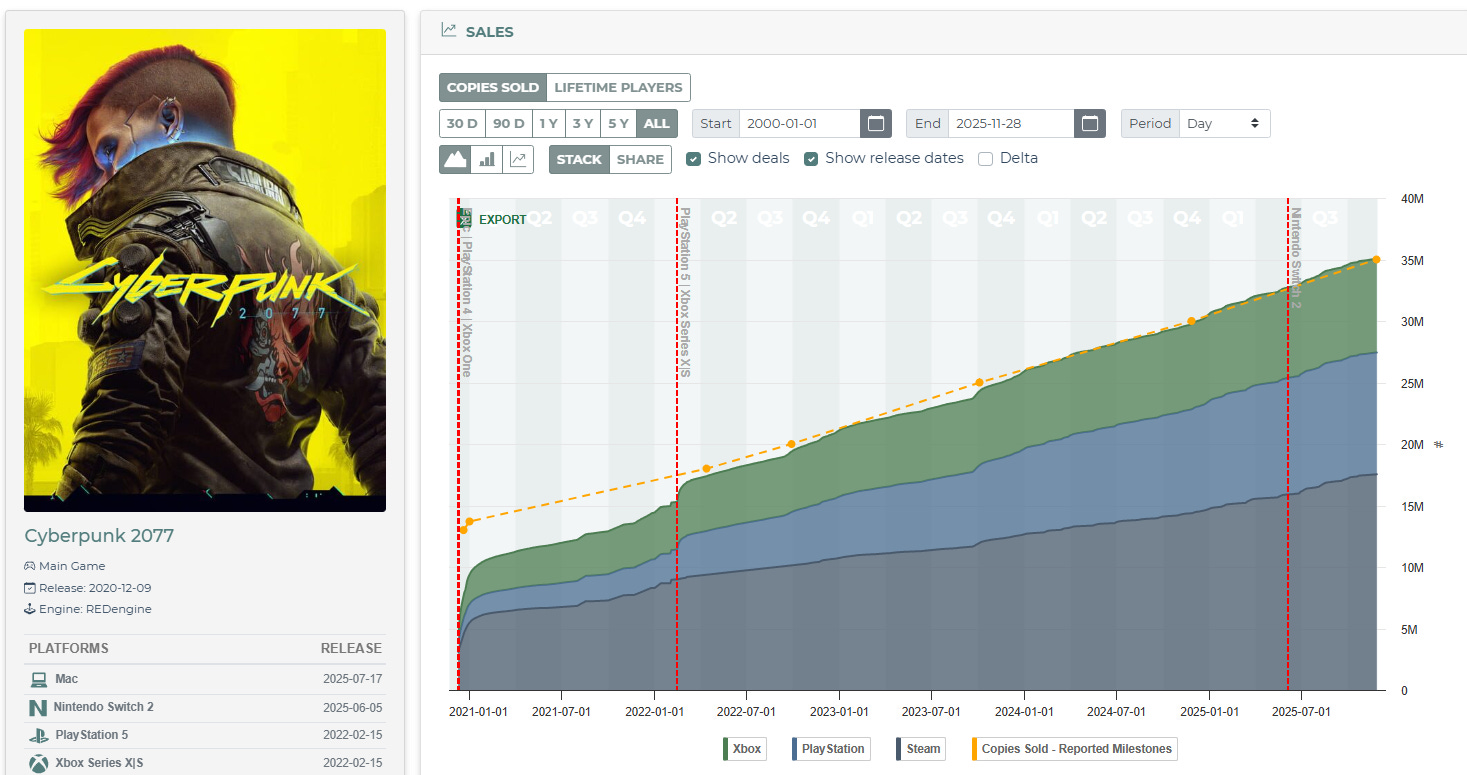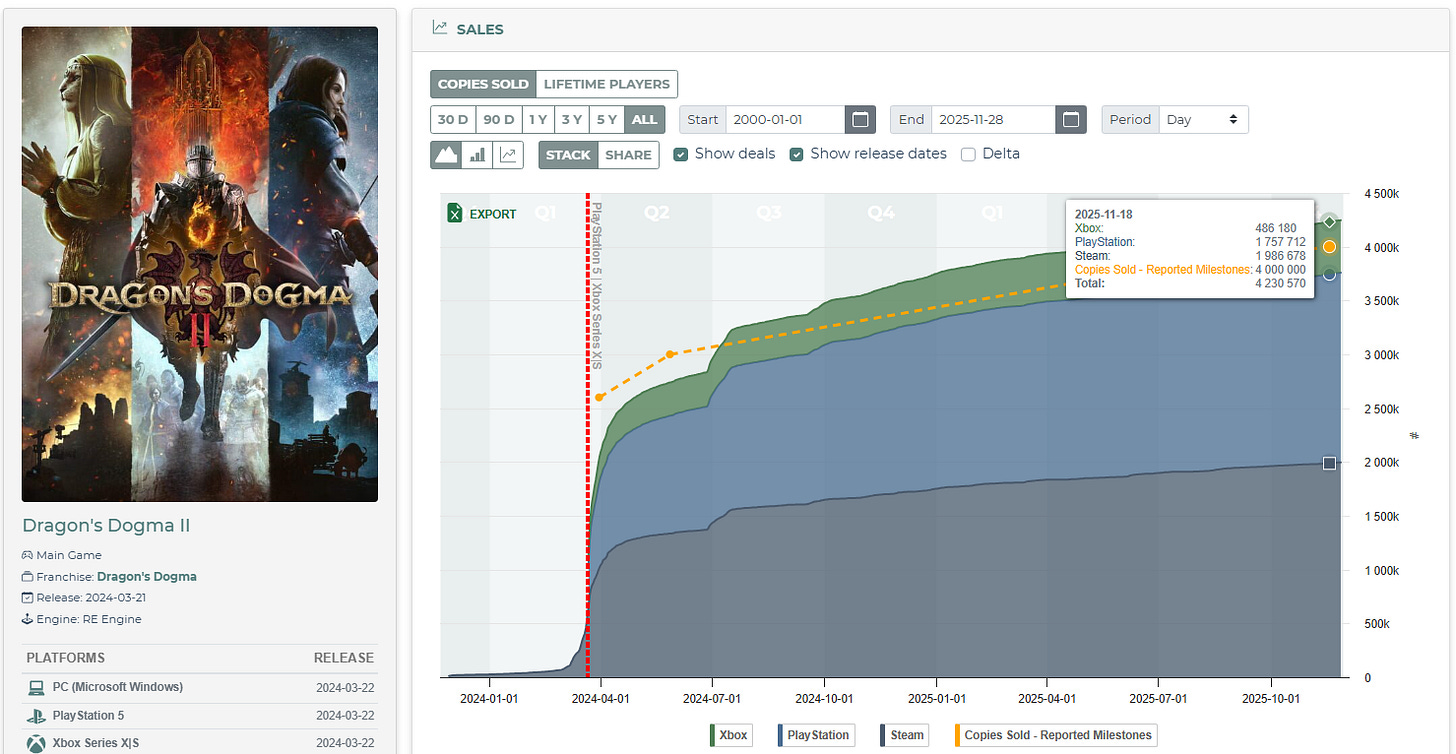 Marvel’s Spider-Man 2 has sold 16M on PS5 and 700K+ on Steam. The Steam numbers have been softer than the first Spider-Man, due to diminishing returns for PlayStation games on Steam. Yet, the PS5 version of Spider-Man 2 still sells between 100K-200K copies a month. Spider-Man 2 is one of those evergreen titles that just keeps selling. It’s a go-to complement to new PS5 consoles, and it’ll have sold another 1M this quarter when all is said and done.