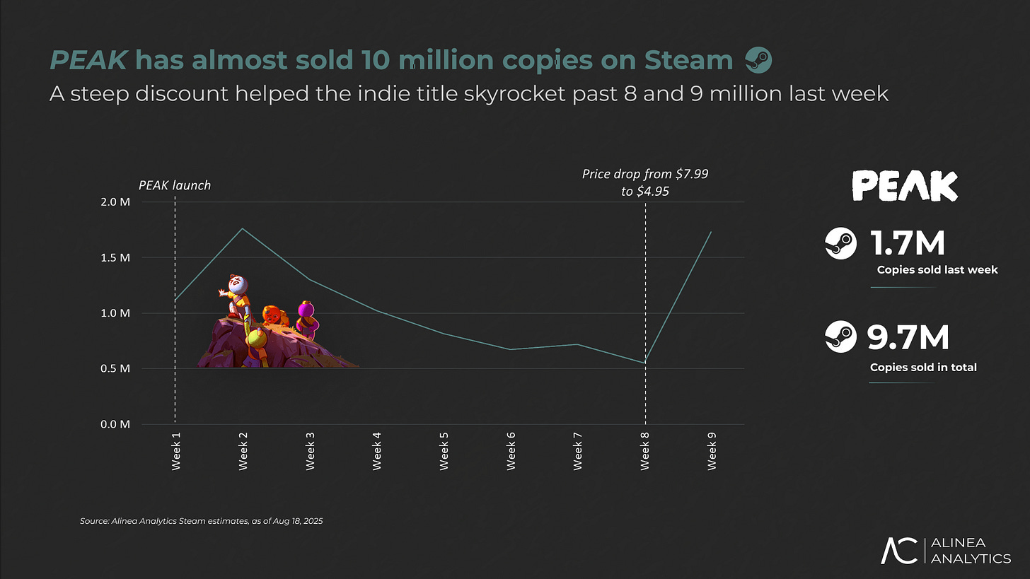 Needless to say, PEAK was the top Steam game by copies sold on Steam for last week (August 11-17). A well-timed early-ish discount can bring an indie success to even greater heights.