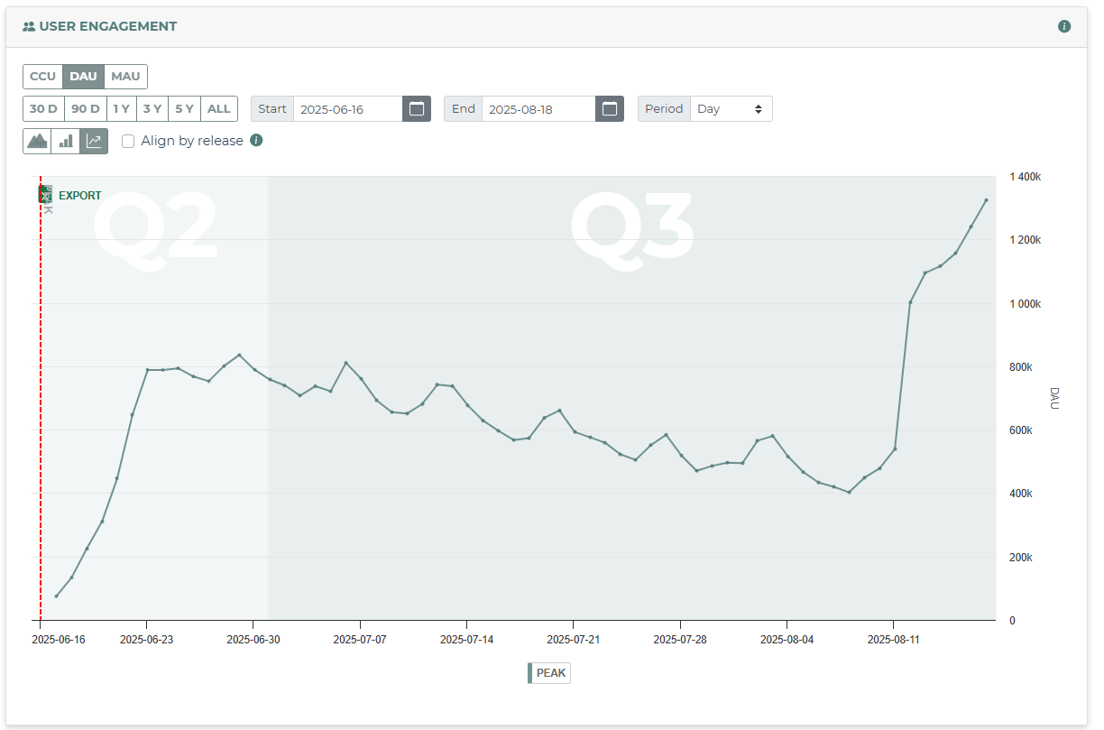 This resulted in PEAK having its most concurrent players ever on Sunday (171 K CCUs). Similarly, PEAK also enjoyed its most DAUs ever on Sunday (over 1.3 million!), which you can see in the Alinea Platform screenshot below: