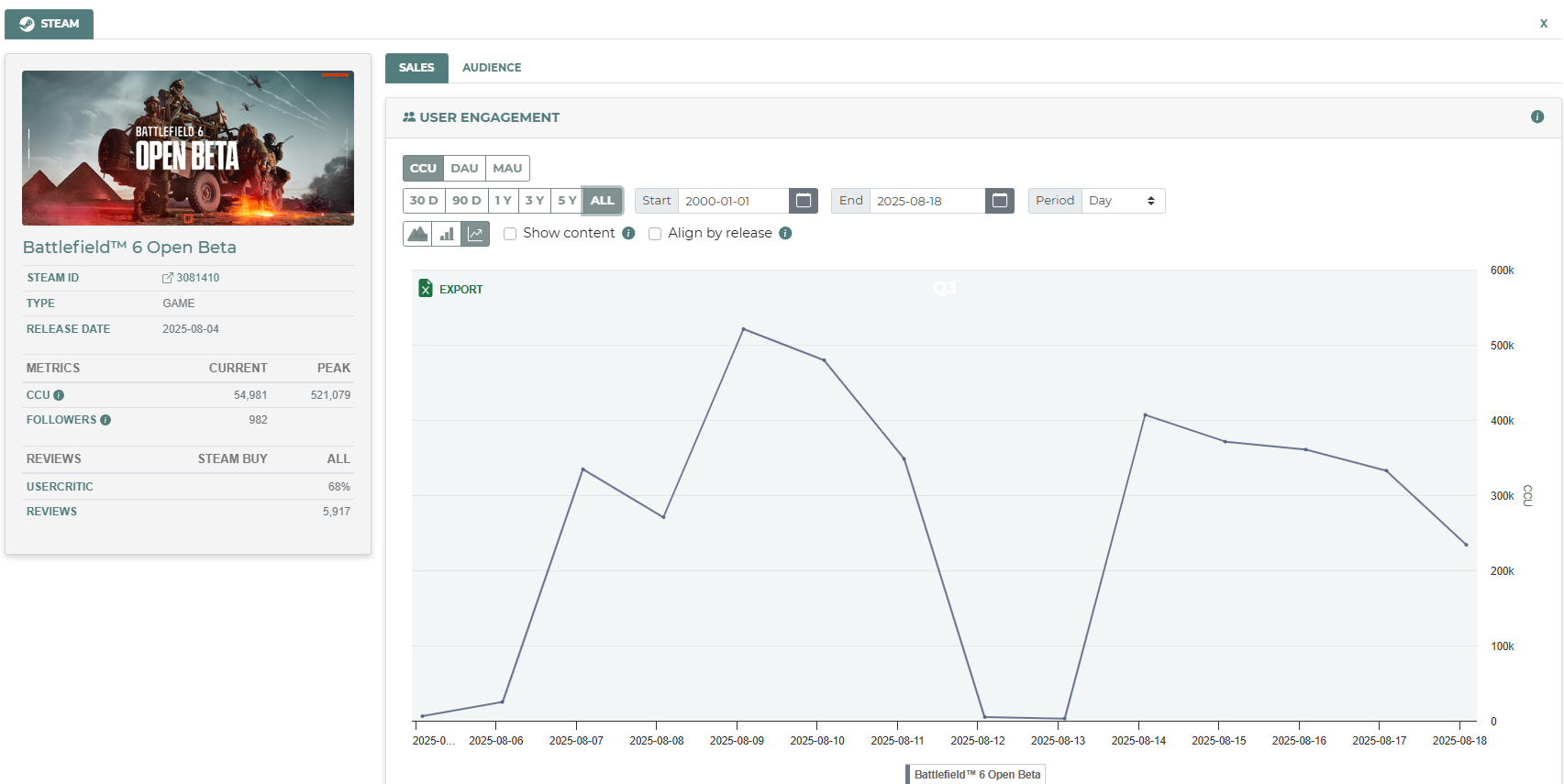 Battlefield 6, which isn’t even out yet, was the #5 Steam game by copies sold last week, with 153 K sold. Following its second public beta, Battlefield 6 reached a total of 715 K copies sold, representing revenues of $40.9 million.