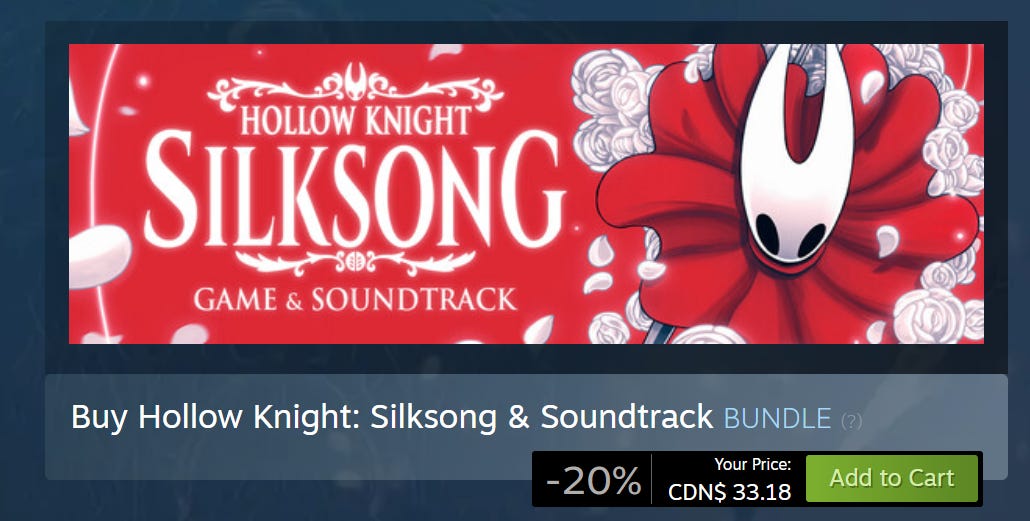 It lets players support a studio they love: Hollow Knight has one of the most dedicated fanbases in indie games, and many of them were going to buy Silksong day one regardless, especially at twenty bucks. By offering a bundle, Team Cherry gave fans a way to spend more without feeling squeezed. The soundtrack is a tangible, desirable extra, not a meaningless upsell. It’s entirely optional for superfans, unlike those early-access collector’s editions.