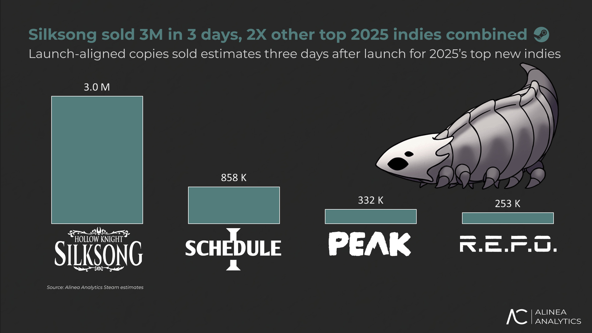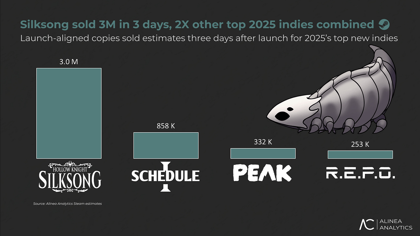 After three days on the market, Silksong outsold its closest 2025 indie competitor by more than 3.5x in the same timeframe. And it sold double the #2, #3, and #4 games combined (launch-aligned in three days).