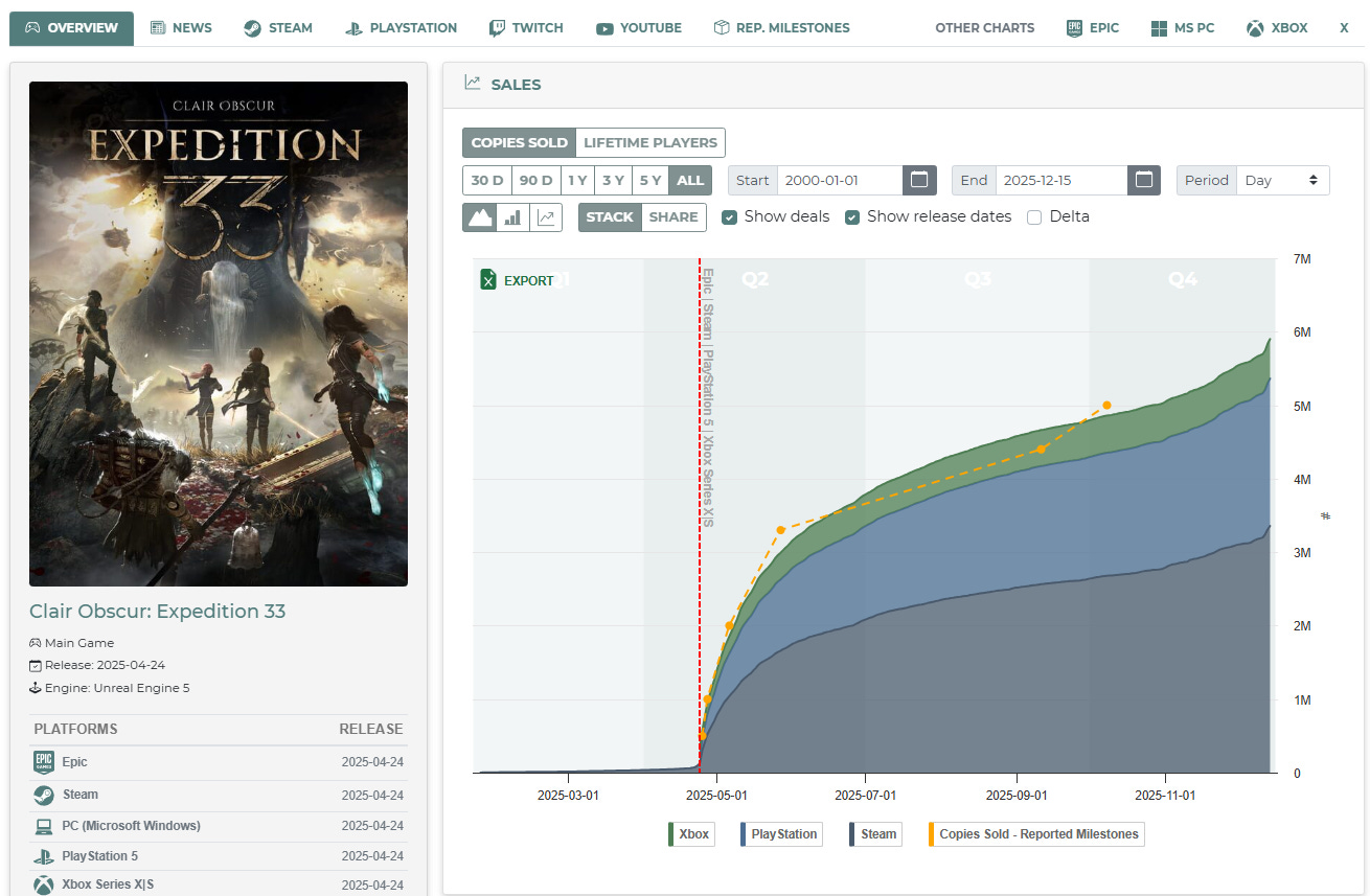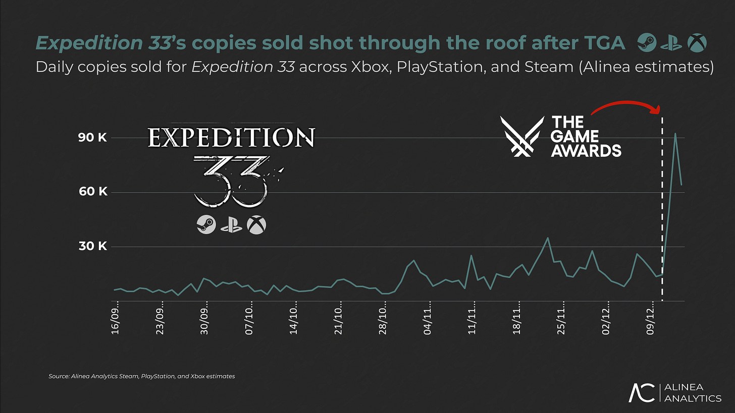 Plus, Expedition 33 sold another 200K copies since its big Game Awards sweep, boosting its daily copies sold by 6x, mostly via Steam and PS5.